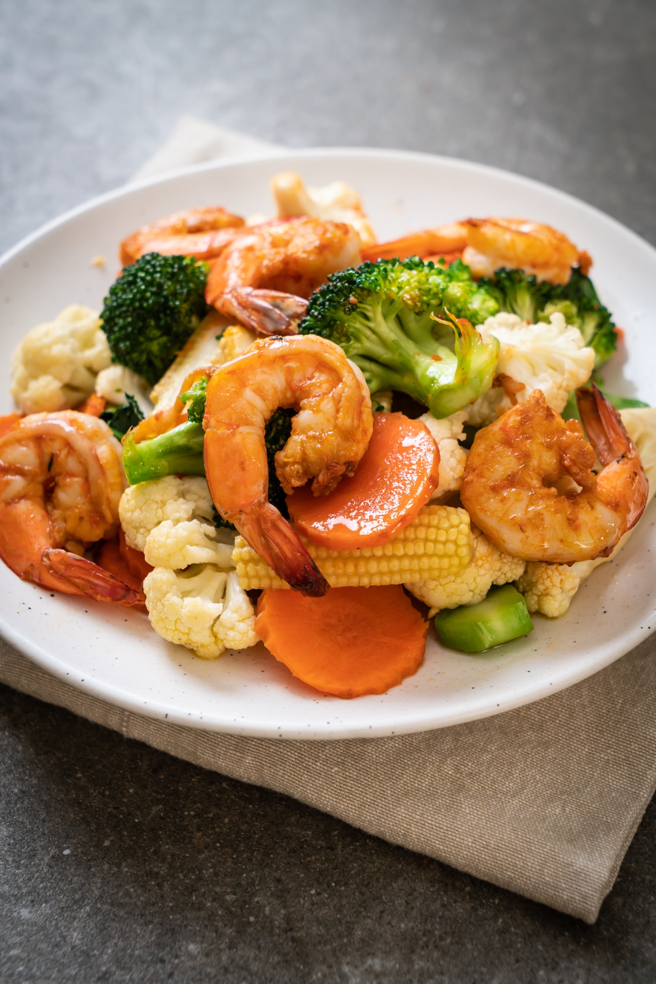 Krewetki Black Tiger (mniejsze) w sosie maślano - czosnkowym z warzywami
